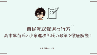 ニュース 自民党総裁選の行方:高市早苗氏と小泉進次郎氏の政策を徹底解説!国民の期待と党内力学 国民は高市氏29%を支持するが、自民支持層では小泉氏33%がトップ。 次の自民党総裁の座を巡る動向が、日本中に大きな関心を集めています。特に、高市早苗前経済安全保障相と小泉進次郎農相の二人の名前が、世... 2025.09.15 ニュース